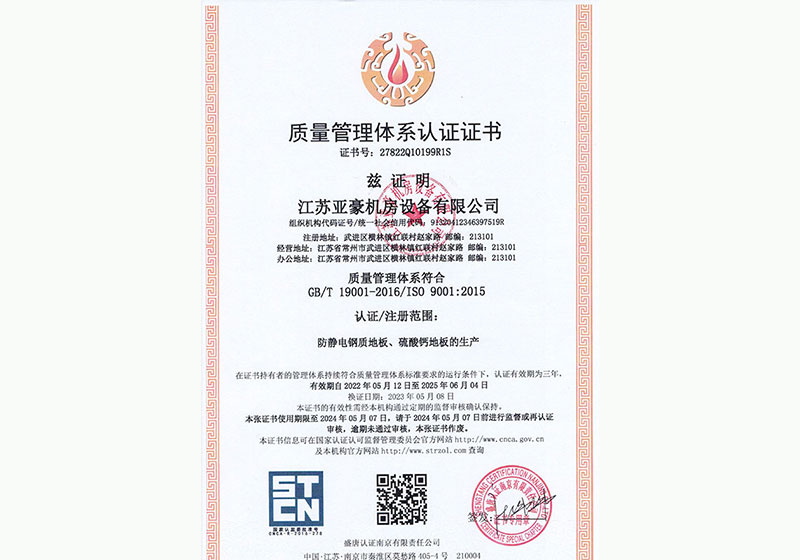 江蘇亞豪機房設備有限公司創建于2015年,坐落在蘇錫常中心地帶,是一家專業活動地板制造商,集設計、制造、銷售、安裝一體并通過ISO9001質量管理體系認證。